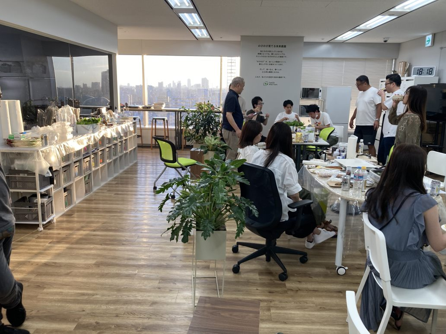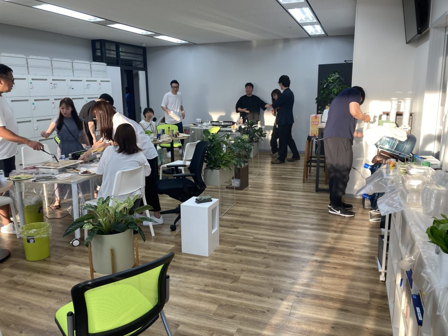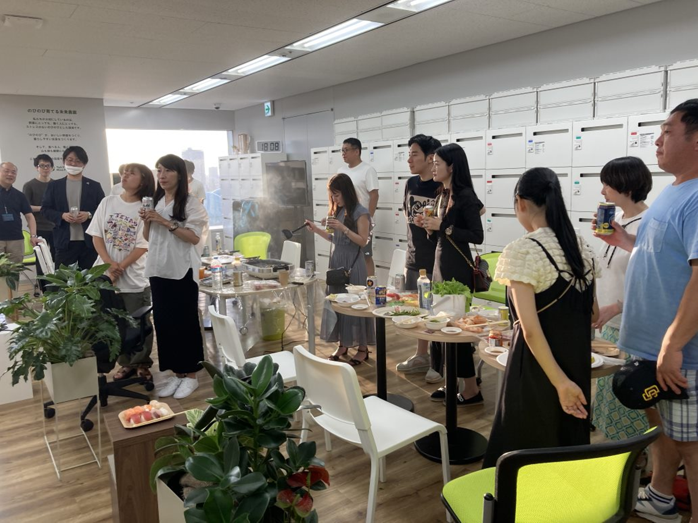 当日は交通機関の混雑が予想されたので、花火の開始より少し前に集まり懇親会を開催しました。17時頃にはオフィスに着いたものの、既に周囲は人が多く集まっていました。4年振りの花火大会なので大盛況だったようです。花火が始まるまで、ホットプレートで焼いたお肉やお野菜をいただきました!