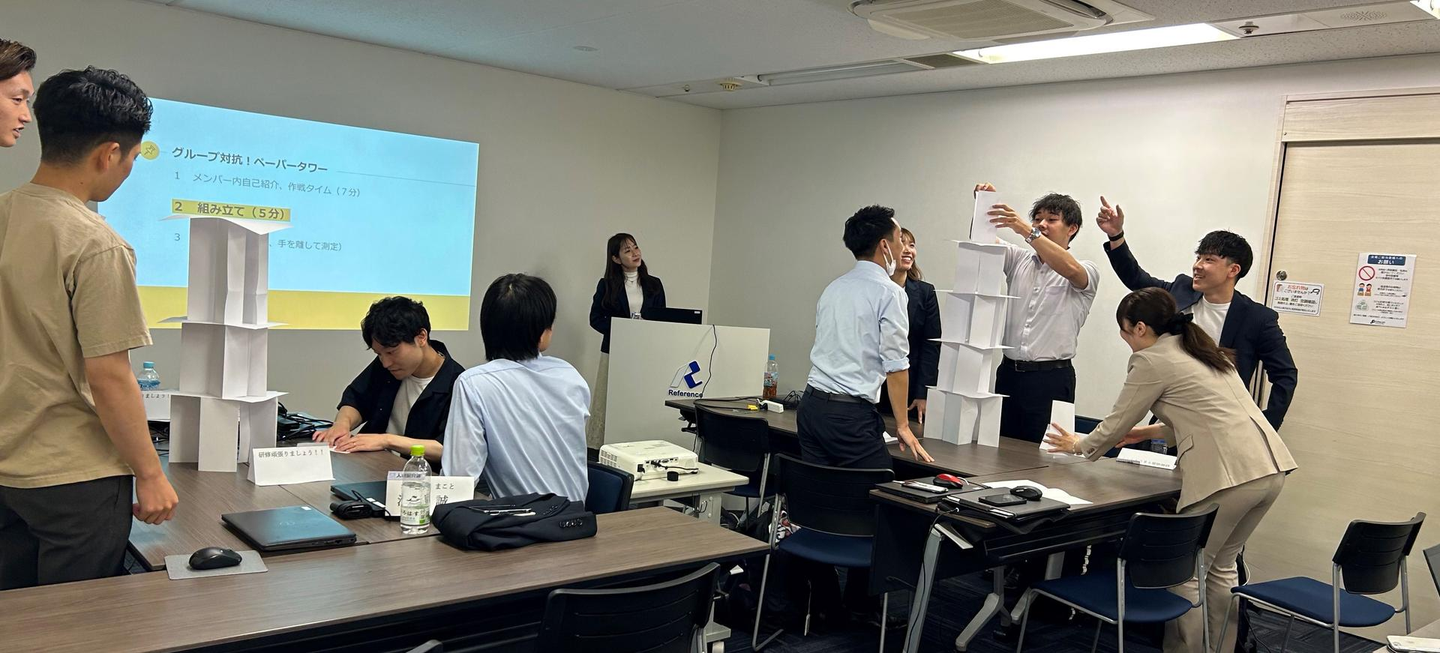 まずは研修の冒頭に、アイスブレイクとしてチーム対抗のペーパータワーを実施しました。