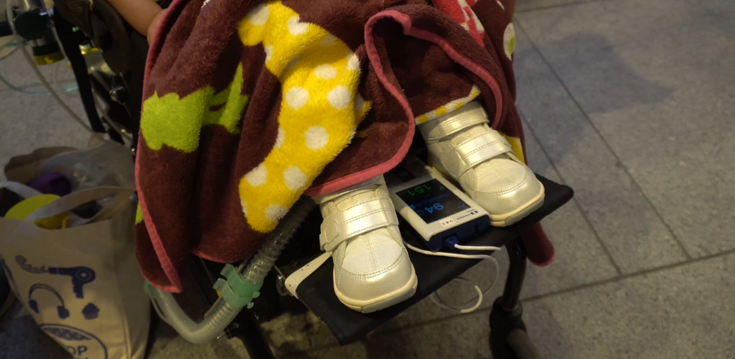 右足から血中酸素飽和濃度のモニタリングをしながら、街の中でも必要な時は吸引等の医療的ケアができるようにしていました。