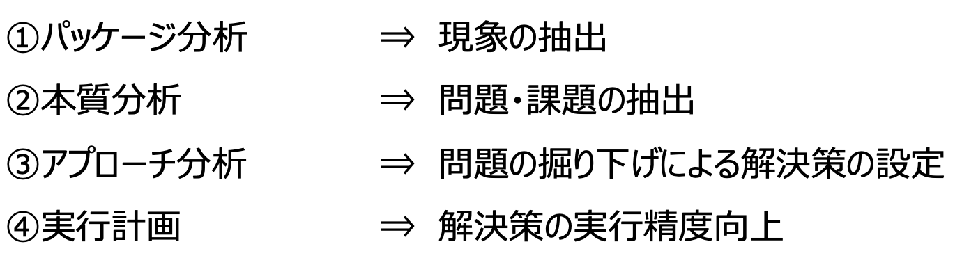 戦略的思考は前項で説明した通り、「パッケージ分析」「本質分析」「アプローチ分析」「実行計画」の