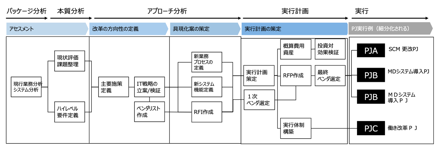 プロジェクトを戦略思考に基づき、パッケージ分析・本質分析・アプローチ分析・計画を
