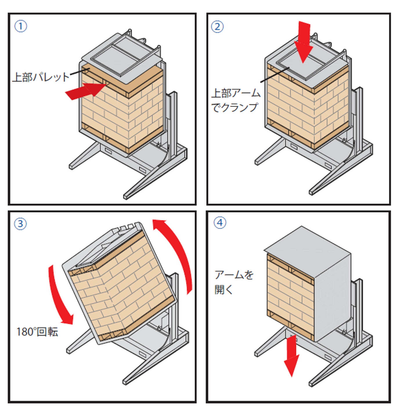 荷物とパレットを載せた状態にすると、下図の要領で荷物をつかんで180°回転し、アームを開くまでの一連の流れを自動で行います。パレットの交換作業や、荷物の積み替え作業に人手をかけず、効率良く行うことができます。