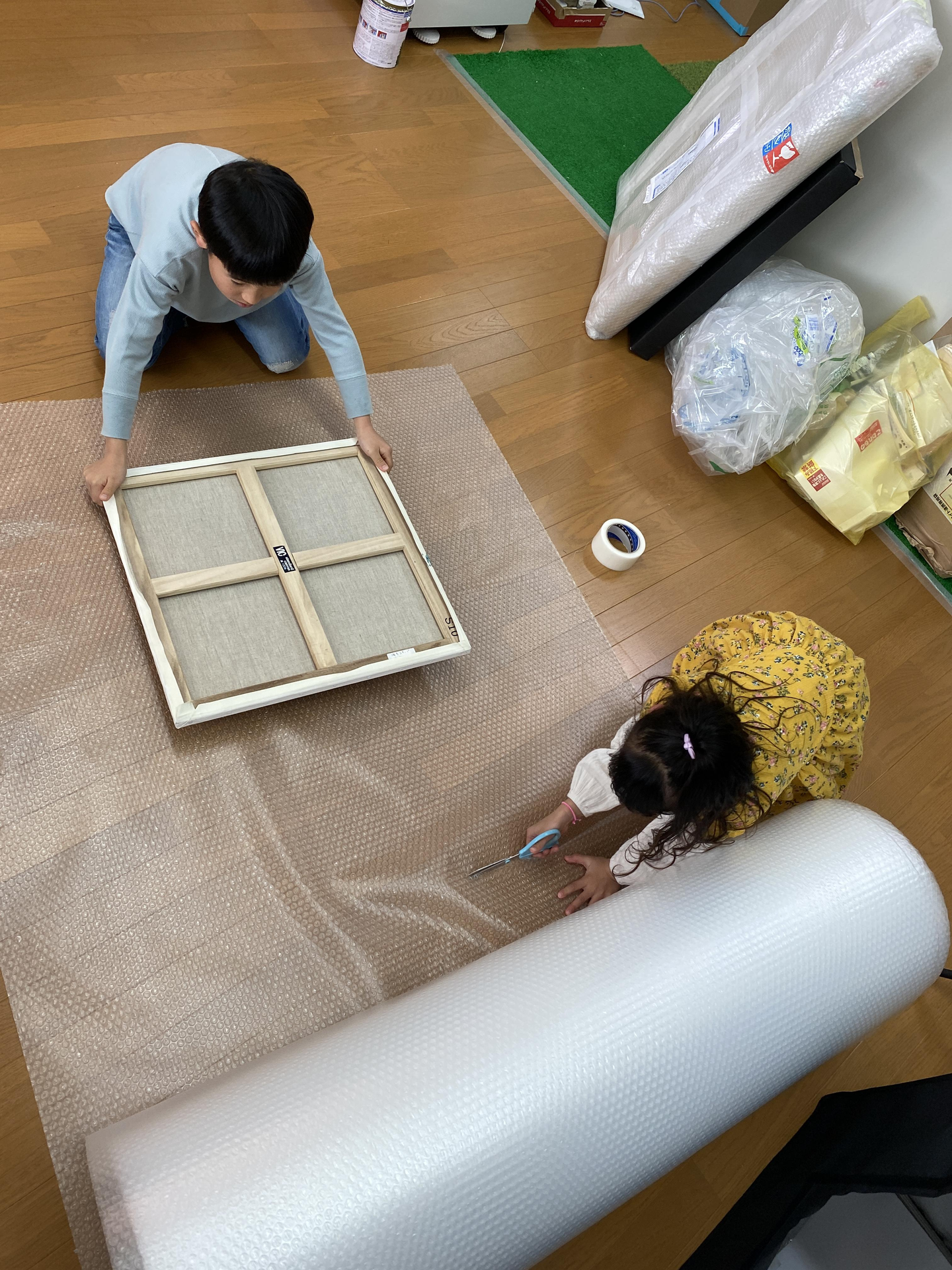 協力しあって保管用作品梱包をやってくれました。父ちゃんの仕事がどんなものなのか、今やってる作業が何のためにやるのか。そこらへんをしっかり説明してあげてます。(あんま聞いてないけどww)