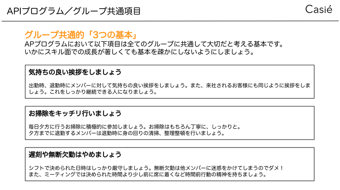 Casieという組織はAPIメンバーも含め会社としてのカルチャー(文化・らしさ)をとっても大切にしています。この大切なカルチャーを維持するためにも全グループ共通項目として「3つの基本」が設定されています。