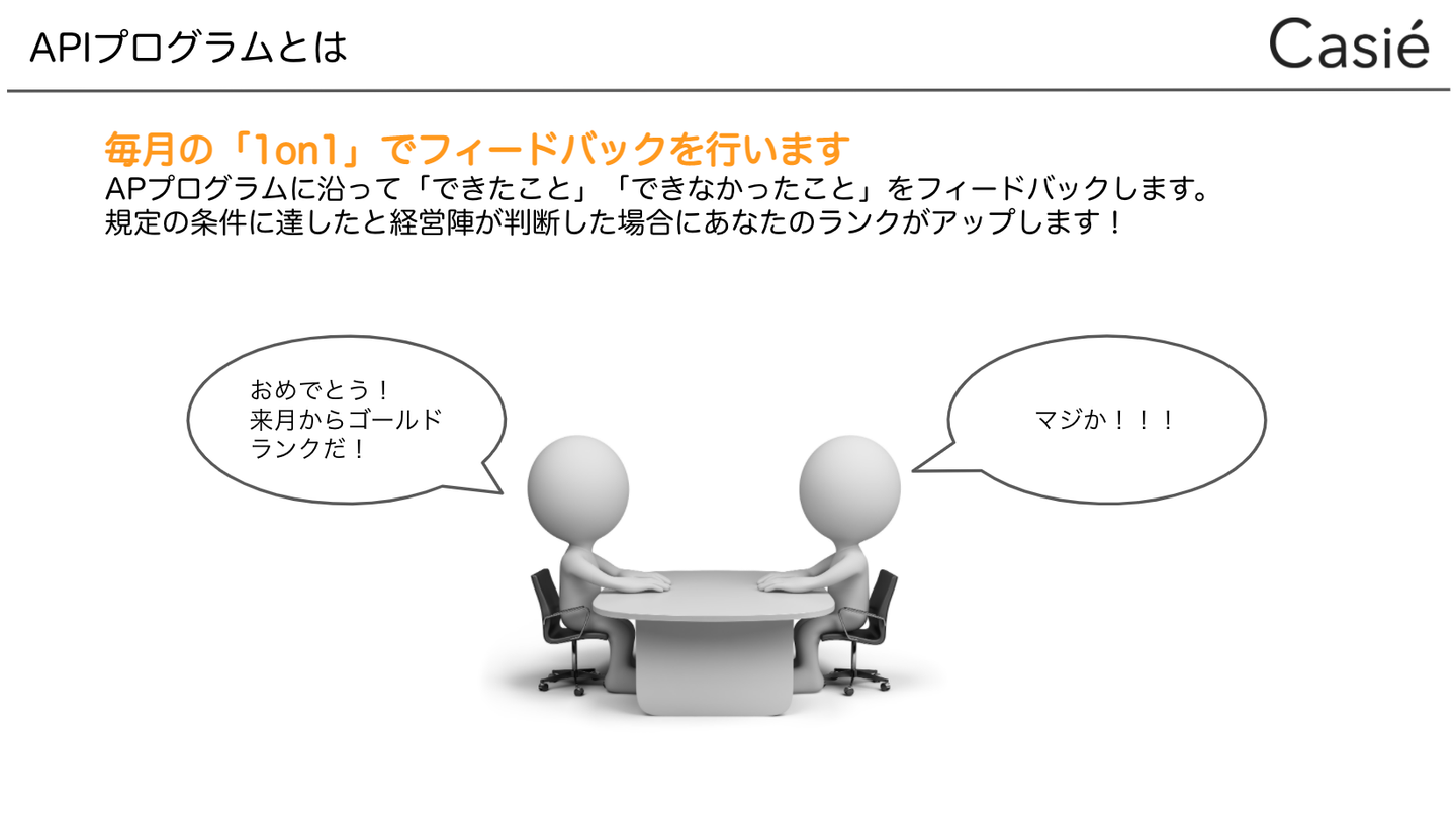 CasieではAPIメンバーを対象に毎月所属グループマネージャーによる1on1がおこわなれます。この1on1によって現在のスキル項目の熟練度とか次のランク項目へのチャレンジ度合いなどを調整しています。