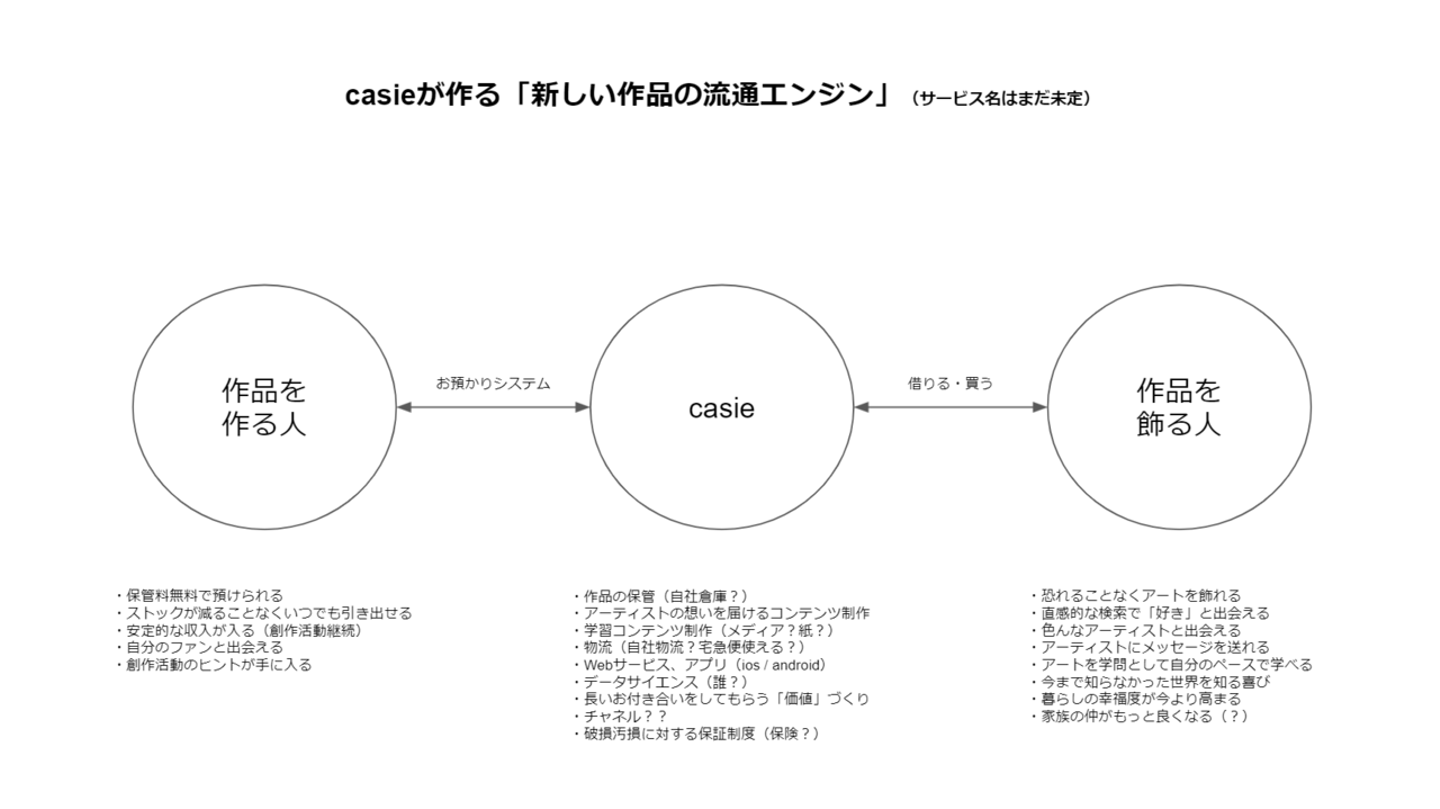 特にアーティストは表現活動が上手なわけで、オリジナルの方法を持ってる。1人でも多くのアーティストが、その表現活動を上手く世の中にデビューさせることができたら、これに影響される人が必ず出てくると思う。まずはそれらを「共有」できる場としてCasieが存在する。共有の場をたくさん作り出せたら、その作品に「共感」を覚える人が出てくる。