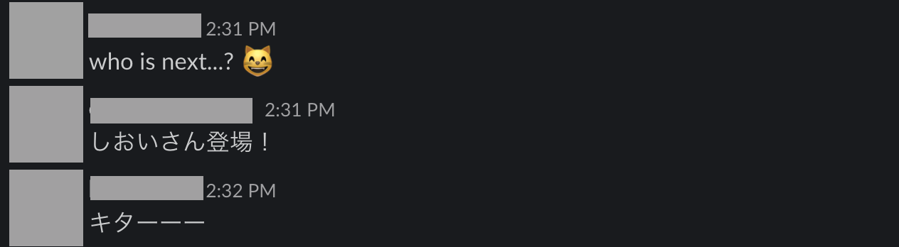 弊社では RubyKaigi を技術力向上のための重要イベントとして位置づけ、費用等のサポートを行っています。発表当日には、チームメンバーが(オンライン上で)集まり、盛り上がりを見せていました。