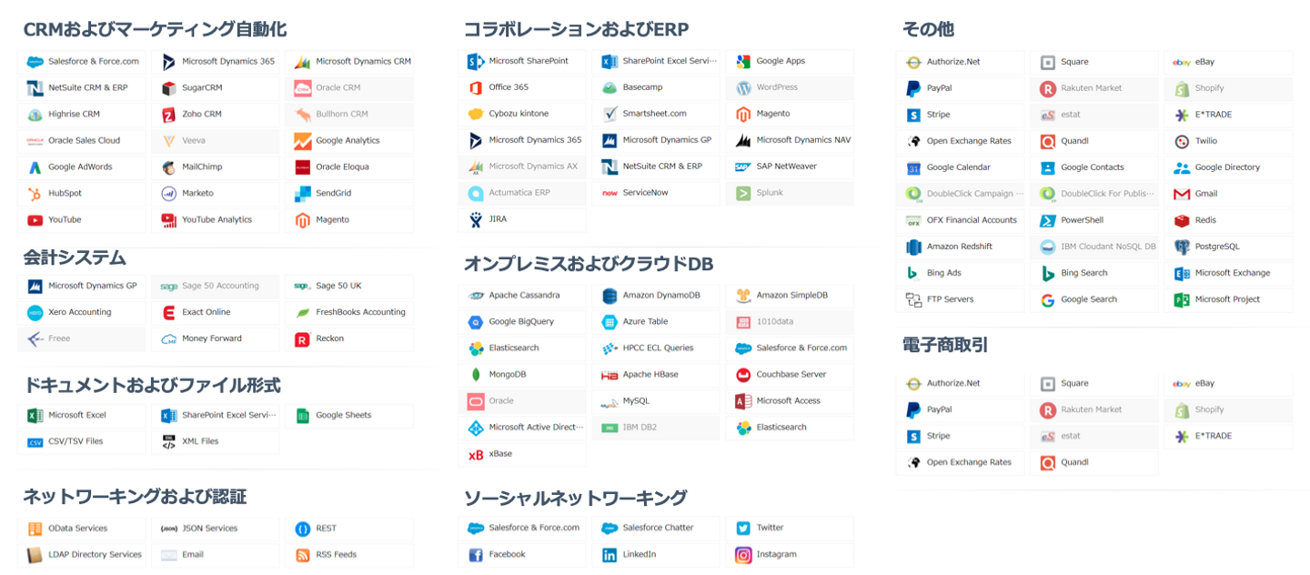 最大の特徴は、業界最多のデータ接続先数です。この記事を書いている時点で200を超えるアプリケーションやデータベースにアクセスできます。この200というのは製品として提供しているデータソースの数で、それに加えて100を超える接続プロファイルを提供しています。
