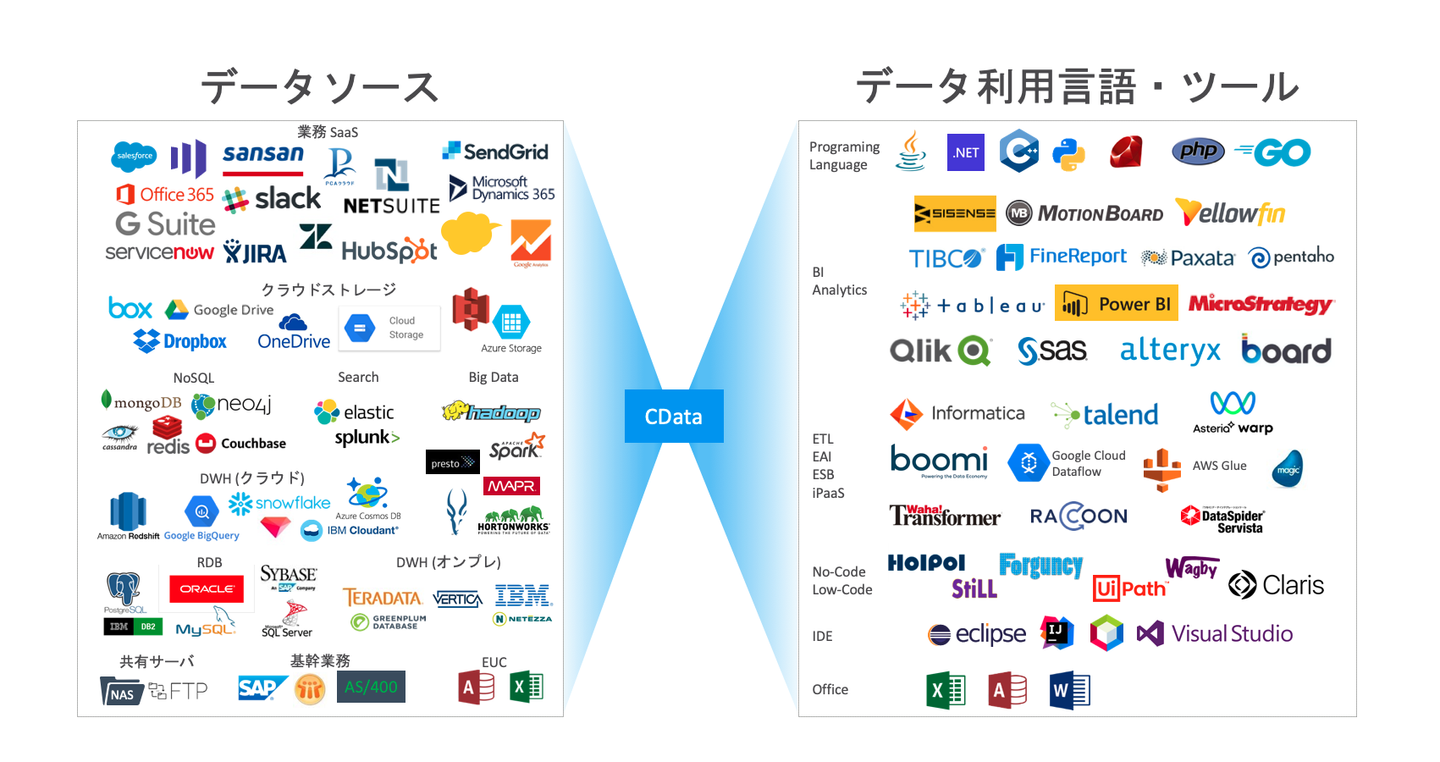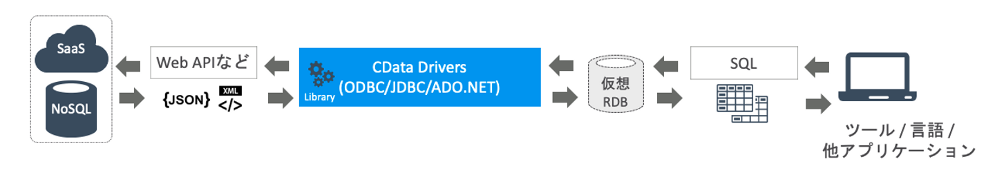 CData製品を利用することで、データの利用者は、これらの多様なデータソースに標準SQL(データベースを知っている人であれば誰でも使える問い合わせ言語)でデータを利用できるようになります。さらにODBC Driver / JDBC Driver / ADO.NET Provider /Python-DBIといったデータを利用するための多くのツールからはノーコードで利用することができます。
