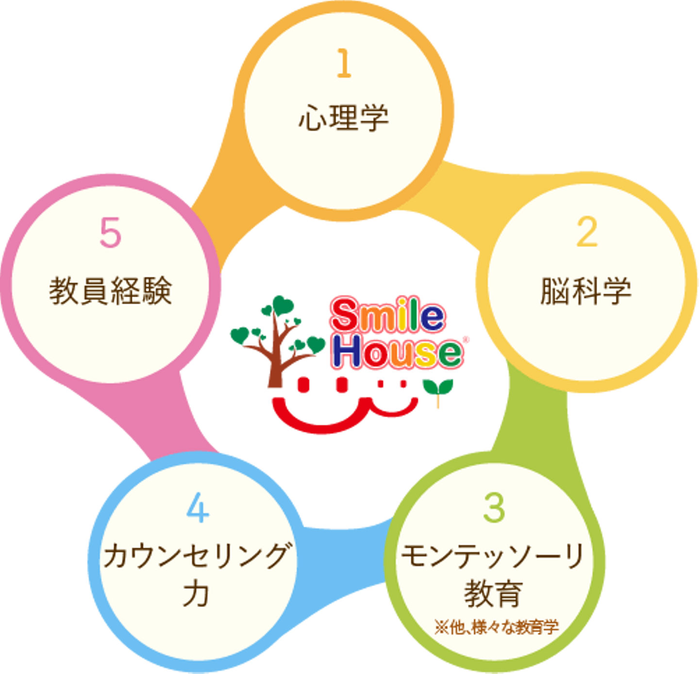 私たちSmileHouseは、これまで、モンテッソーリ教育はもちろん、心理学や脳科学など幅広い知識や理論を整理するとともに、カウンセリングなどの多くの臨床経験を行ってきており、 人の心の仕組みを研究するとともに、一人ひとりのありのままを尊重すること、また実践を通して、その人の気づきや気持ちや考えの整理をするお手伝いをしてきました。