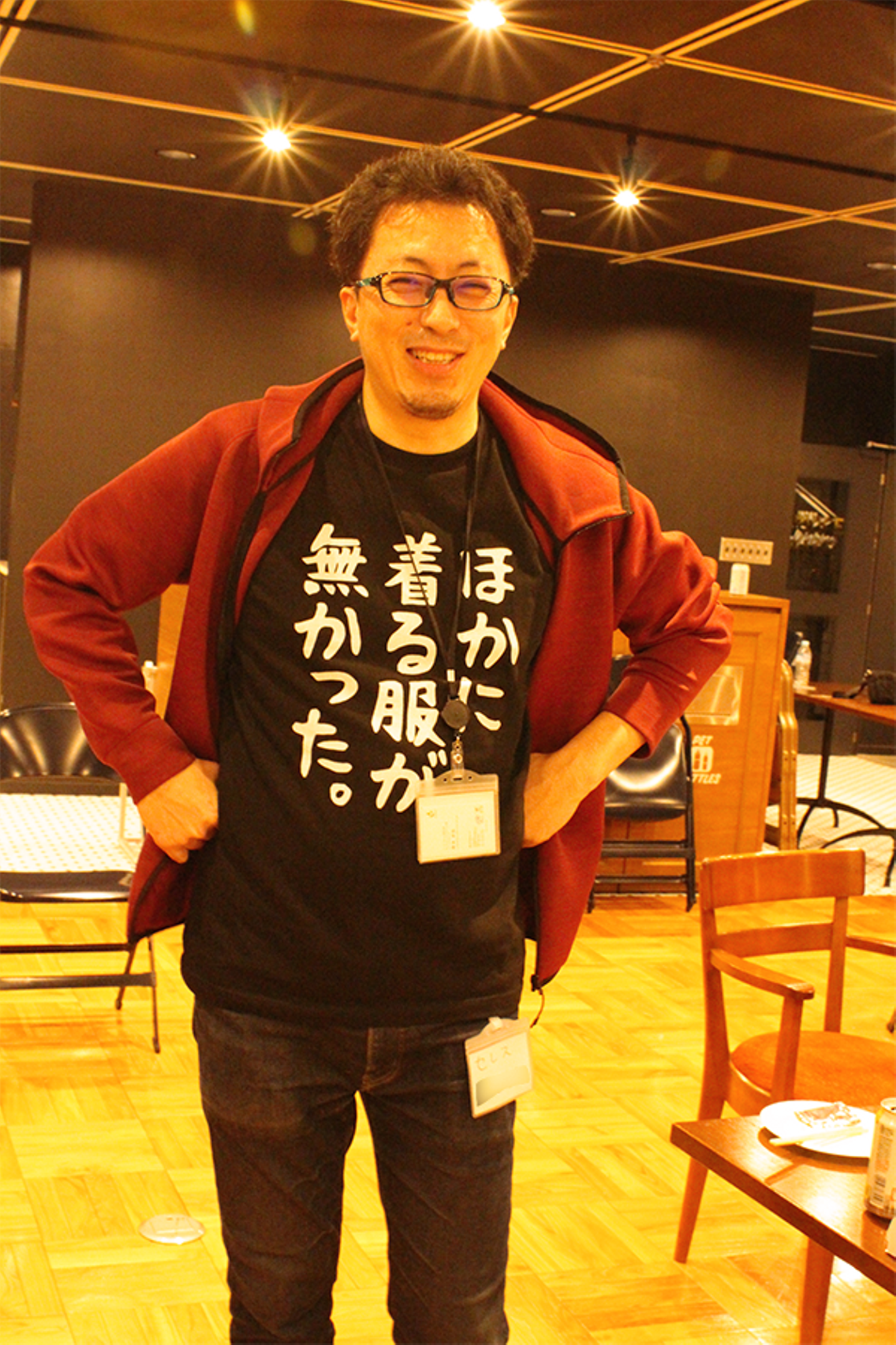 ~懇親会での一コマ。最後までだれからもツッコミが入らなかった「ほかに 着る服が 無かった。」Tシャツを着て記念に1枚!~