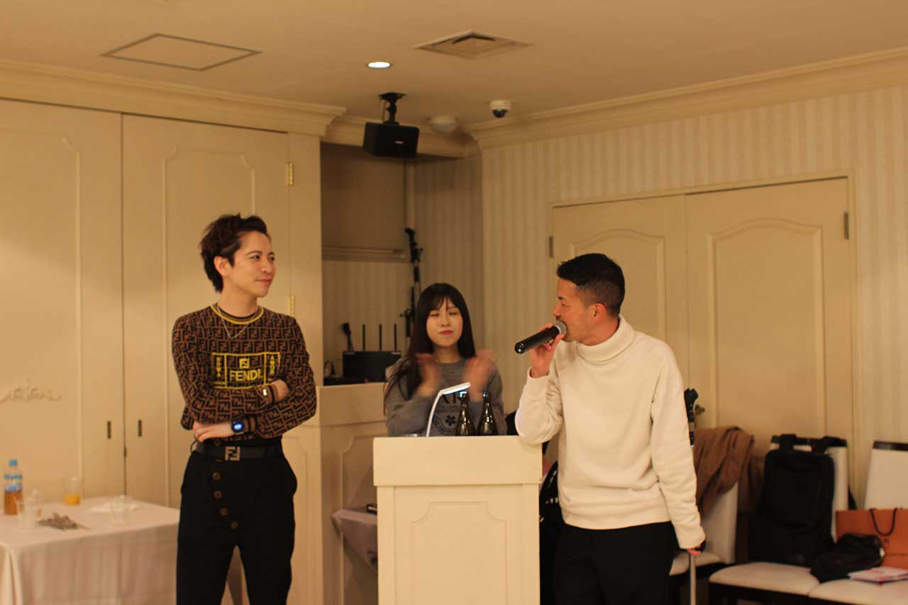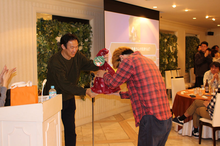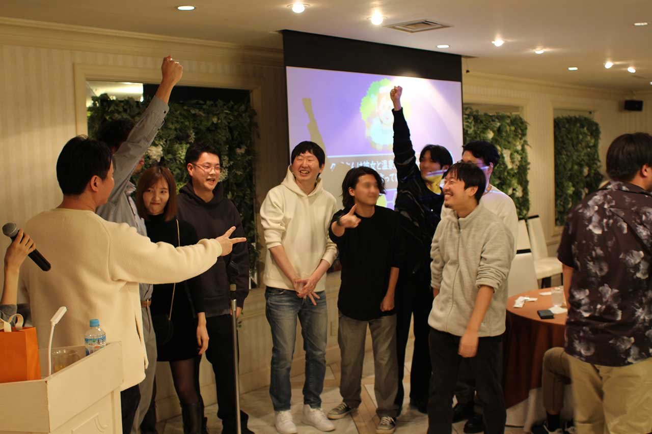 役員から社員、アルバイトまで全従業員が参加した全社会もいよいよお開きとなりました。閉会の挨拶は野﨑副社長から。冒頭、この全社会を企画運営進行した新卒メンバーに向けて、「この人たちのおかげで、楽しい時間を過ごせました。ありがとうございます!みんな、拍手!」という労いの言葉とともに、会場から拍手が沸き上がりました。