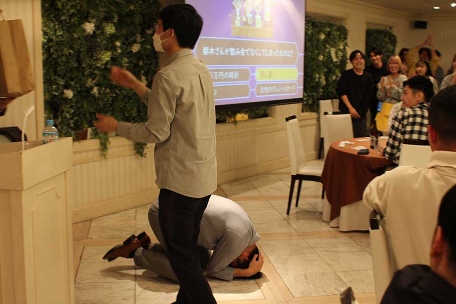 全社会のプレゼント企画として、ボードメンバーにまつわる“トリビア(素敵なムダ知識)”ネタから「人生で50回以上ディズニーランドに行ったことがあっても、絶対に乗らない乗り物はなに?」「前職のあだ名はなに?」「愛犬に水を飲ませるのが難しい理由はなに?」など、全10問の4択クイズを出題!