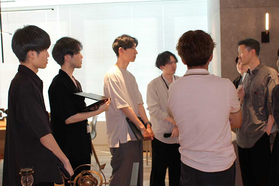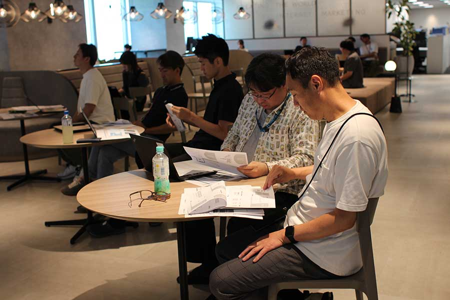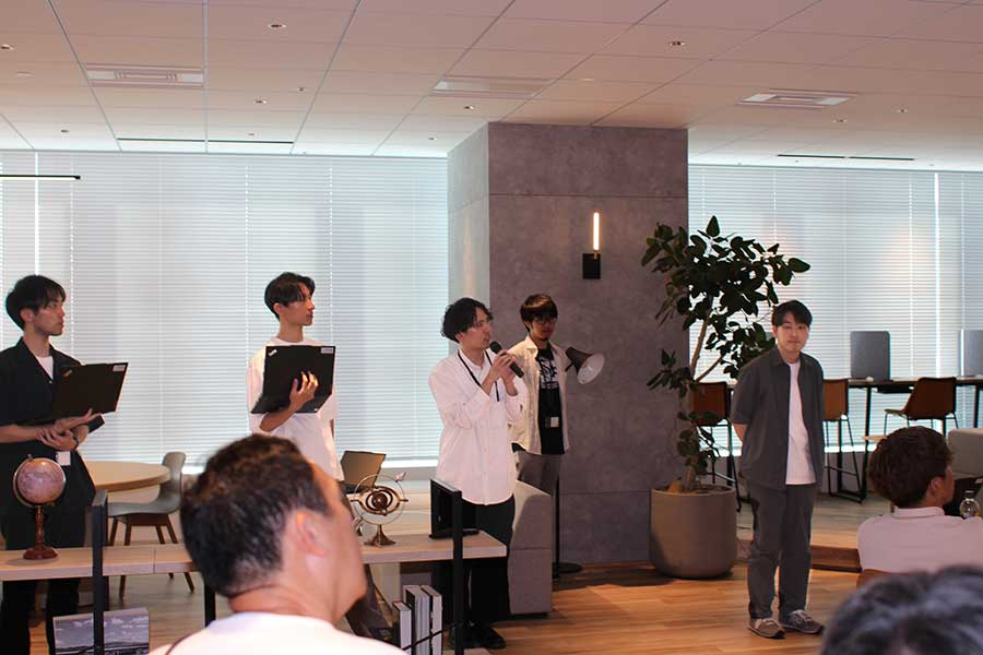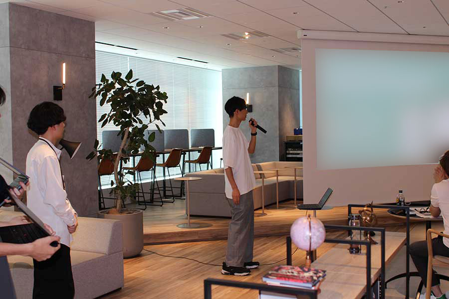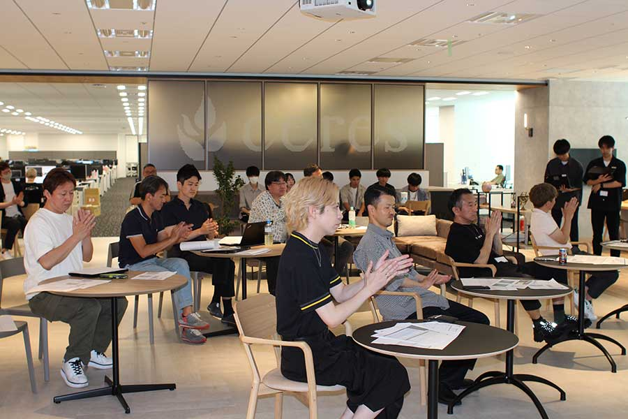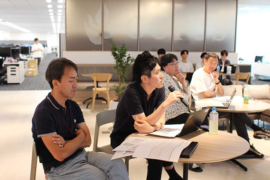 前年までは会議室が会場だったため、発表会の全貌はごく“限られた人のみぞ知る”という感じでしたが、新オフィスからは社員が自由に行き来するカフェスペースが会場となったことで、経営陣以外の従業員も自由に見学できるようになりました。