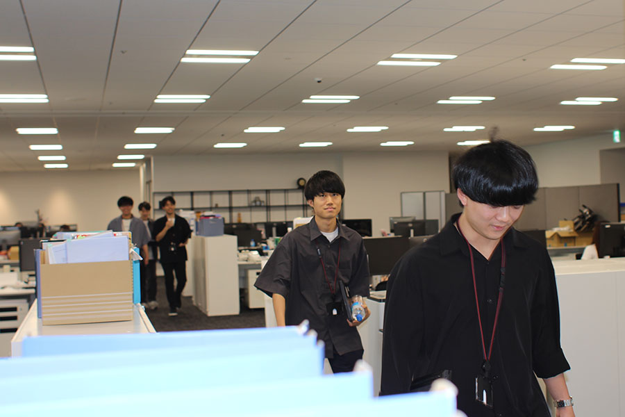控え室から会場のカフェスペースに移動する【24卒】のみなさん。この2ヶ月半を費やしてきた発表会もいよいよです!