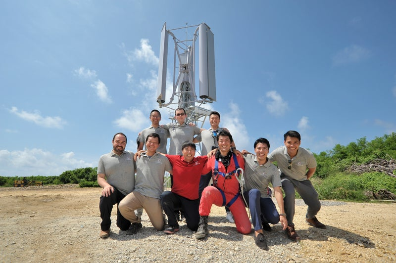 ▲ 石垣島の10kWマグナス風車完成時の記念写真(左端が本人)