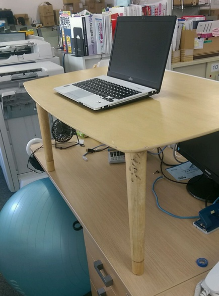 既出のバランスボールに加えて、デスクにおけるちゃぶ台もご用意しています。座りに飽きたらたってお仕事できます。ちなみにこれは私の隣のAくんの席です。二人並んでバランスボールで愉快に働いています。長時間同じ姿勢になるのを防ぎ、健康リスクを減少させます。