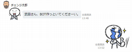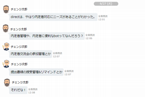 このところチェンジでは事業ユニットを越えて協業するシーンが増えてきていて、社内チャットのトークルームにも『○○ユニット×○○ユニット』というルームが複数存在しています。その中に『人材開発チームとモバイルチームメンバーが参加するボット作って何かやろうぜ!』ルームがありました。6月下旬のある日の会話。