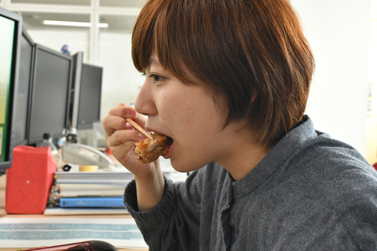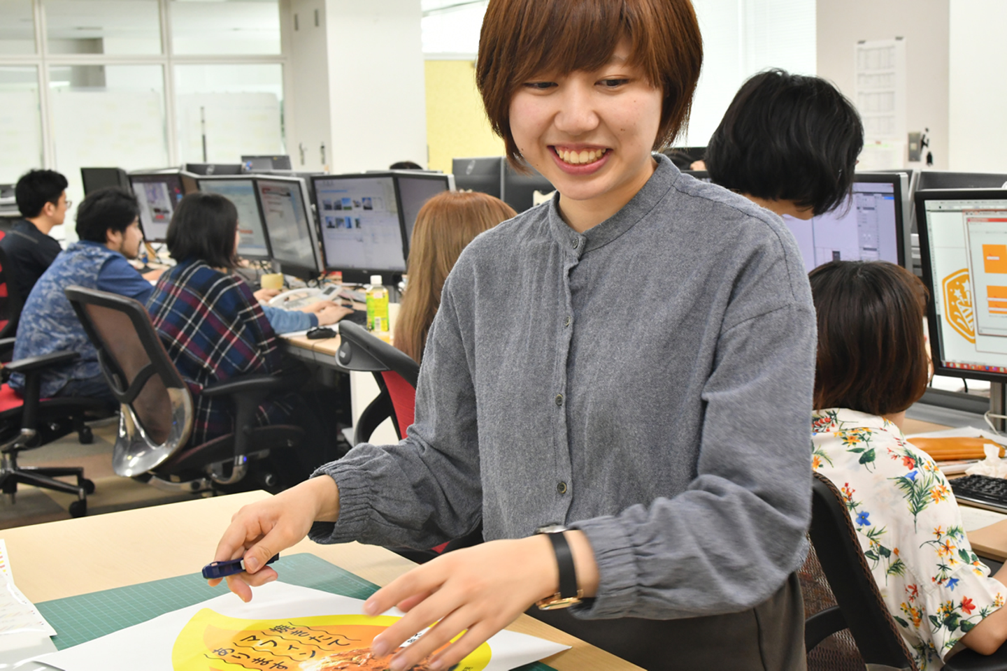 印刷物やWEBサイト内に使われるイラストを描いたり、先輩方の制作サポート、お客様対応など色々やっています。また、社内イベントがある時は積極的に役割を担って頑張っています。