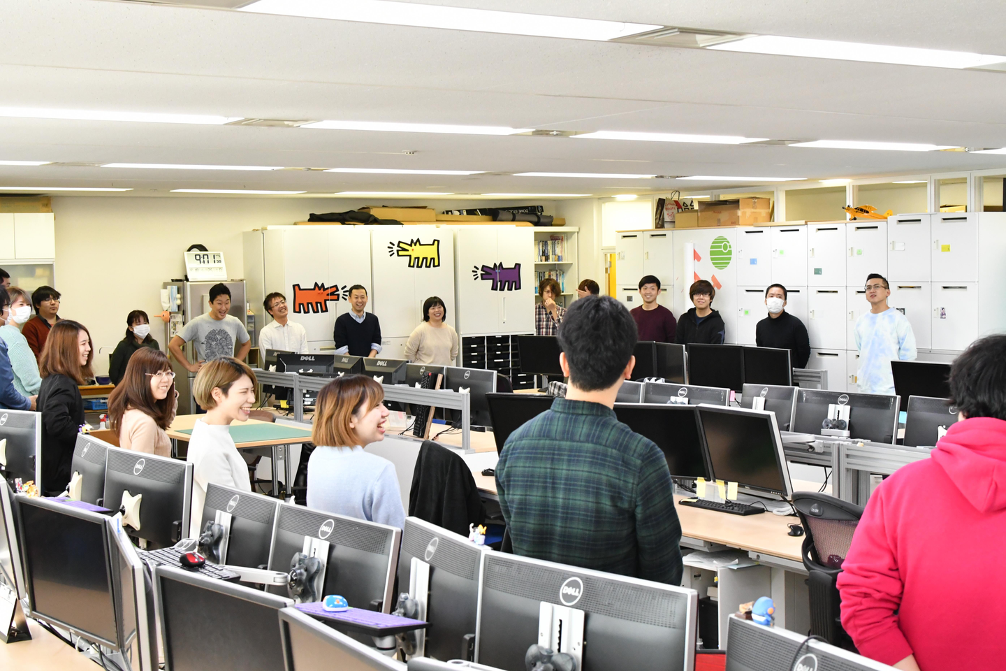 社員一同、一目散にオフィス中央へ集まり、お土産やお菓子の争奪戦が勃発します!