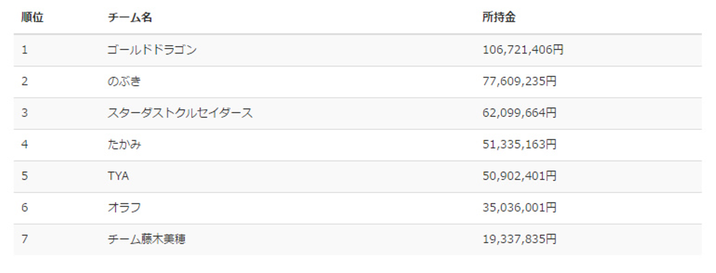 追いすがる「超世代維新軍:のぶき」チームを抑えつつ、ゴール順も1番、所持金も1番の完全優勝です!すごい!かっこいい!大統領!!
