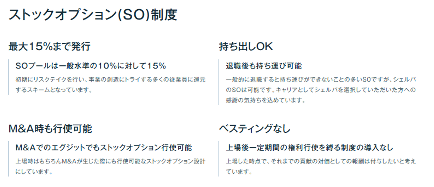 - 将来性:15%のSOプールと持ち出し可能な従業員フレンドリーな制度