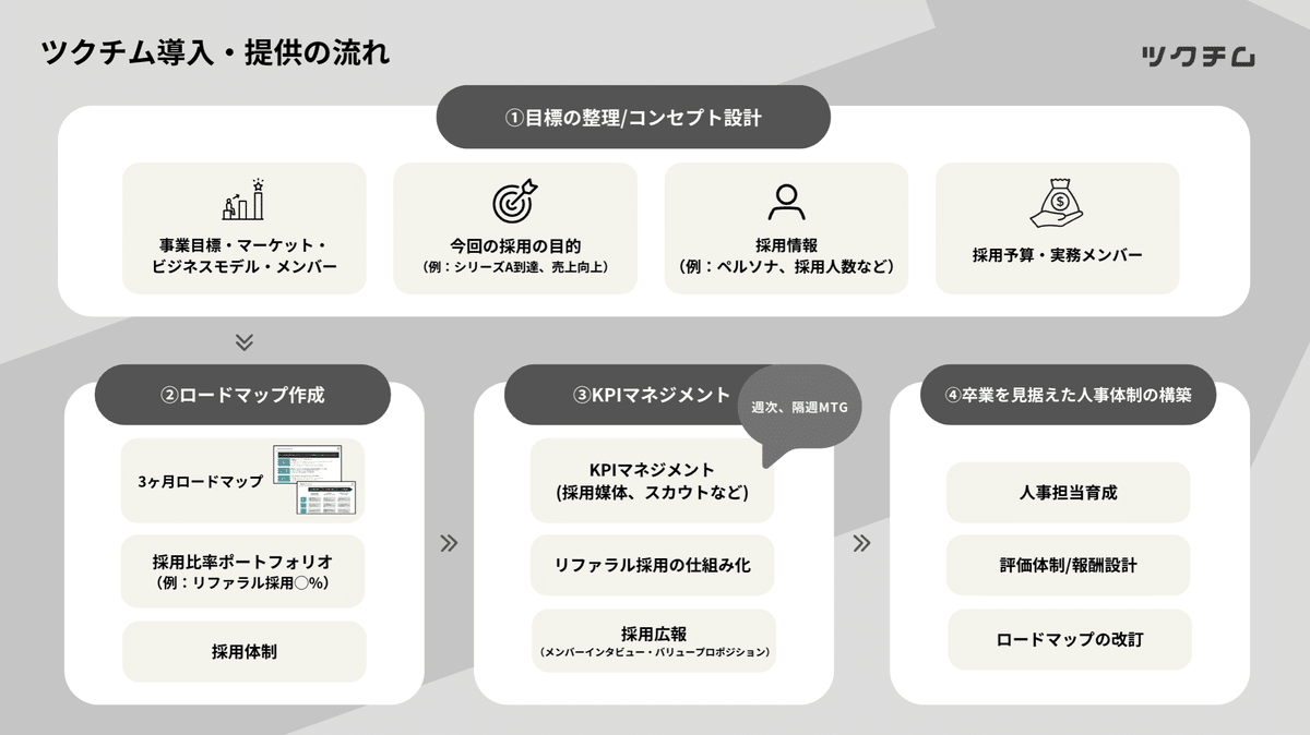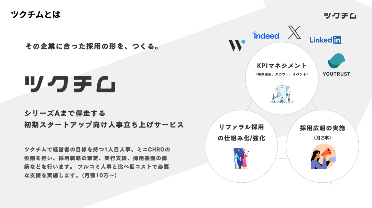 私たちが提供する「ツクチム」は、主に専任人事がいないシード〜シリーズA前の初期スタートアップ企業向けに、AIを活用しながら月額10万〜で、次の目標(調達・売上)に対しミニマム採用/人事機能の立ち上げを行うサービスです。