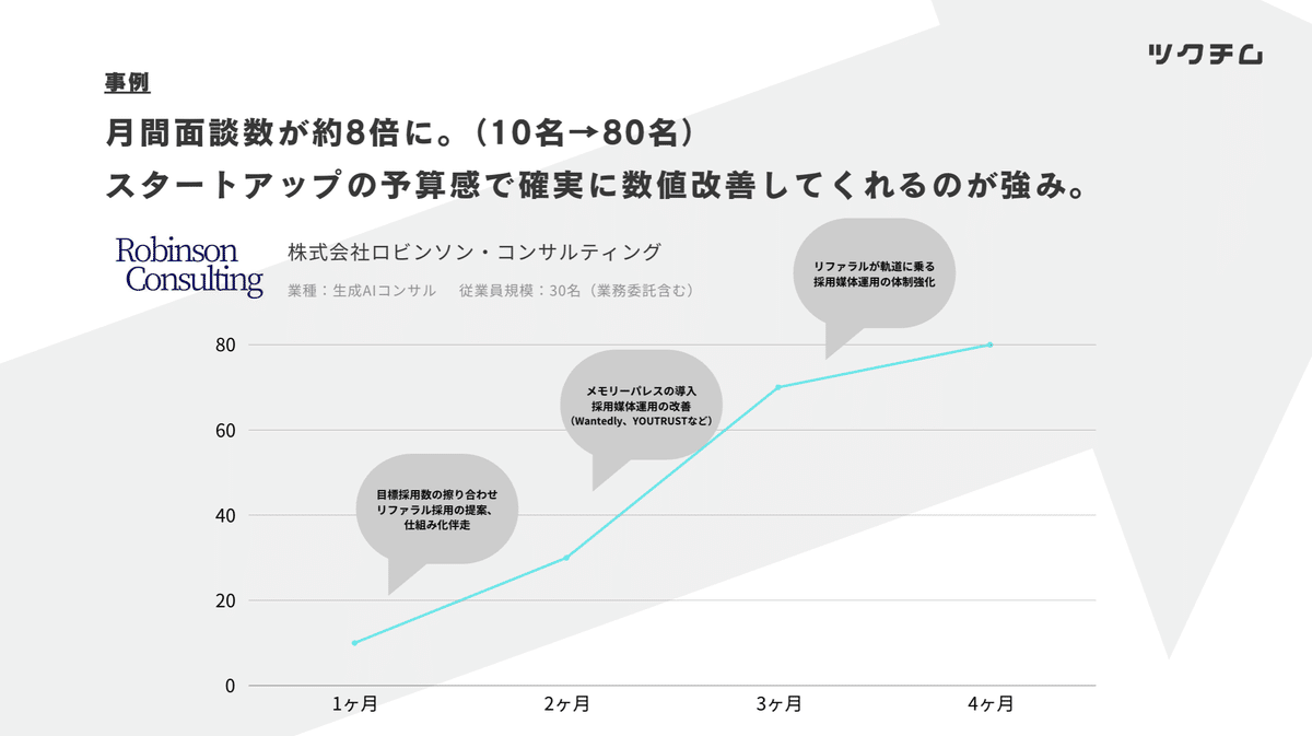 といったありがたい声をお寄せいただきました。中には面談数が月10名→8倍以上に増加したケースもあり、組織の成長スピードを加速させることができました。