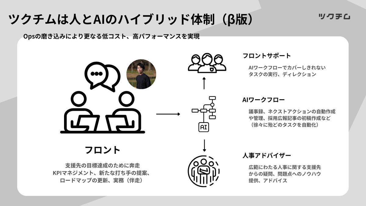 経営者視点をもつフロント(人事)と、その裏側でタスクを効率よく実行するAIデジタルワーカーによって低コスト・高カバー範囲を実現 - シリーズA到達時に専任人事へバトンタッチ