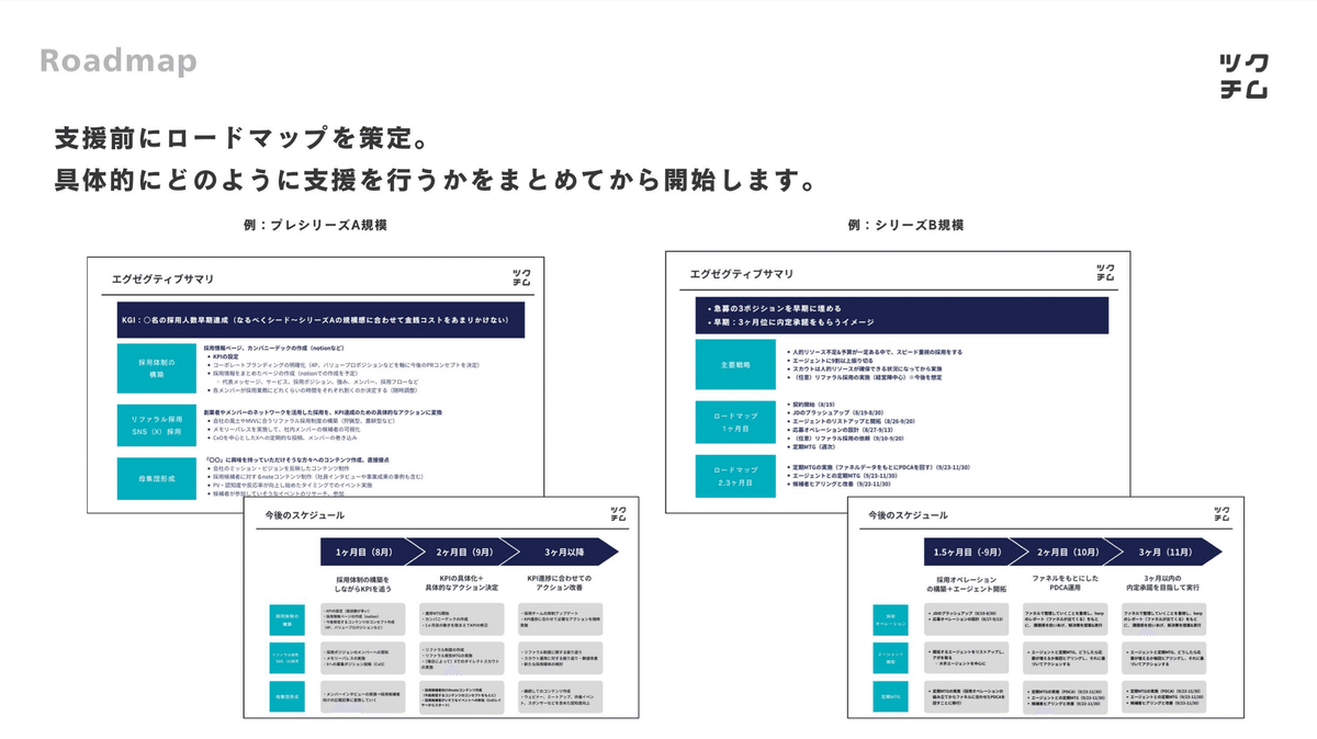 スタートアップの採用ニーズからご支援を始め、採用目標の達成を第一に、組織力を上げていく施策も並行して進めていき、シリーズA到達時での専任人事の引き継ぎを行う"バランス力"を大事にしています。