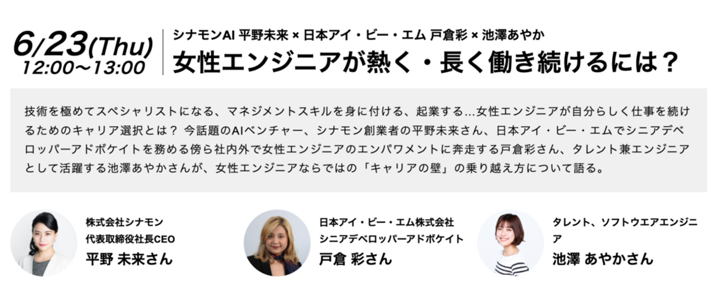 社長CEO平野は、「女性エンジニアが熱く・長く働き続けるには?」をテーマとしたセッションに、日本アイ・ビー・エム 戸倉彩さん、タレント・ソフトウェアエンジニアの池澤あやかさんと共に登壇いたしました。