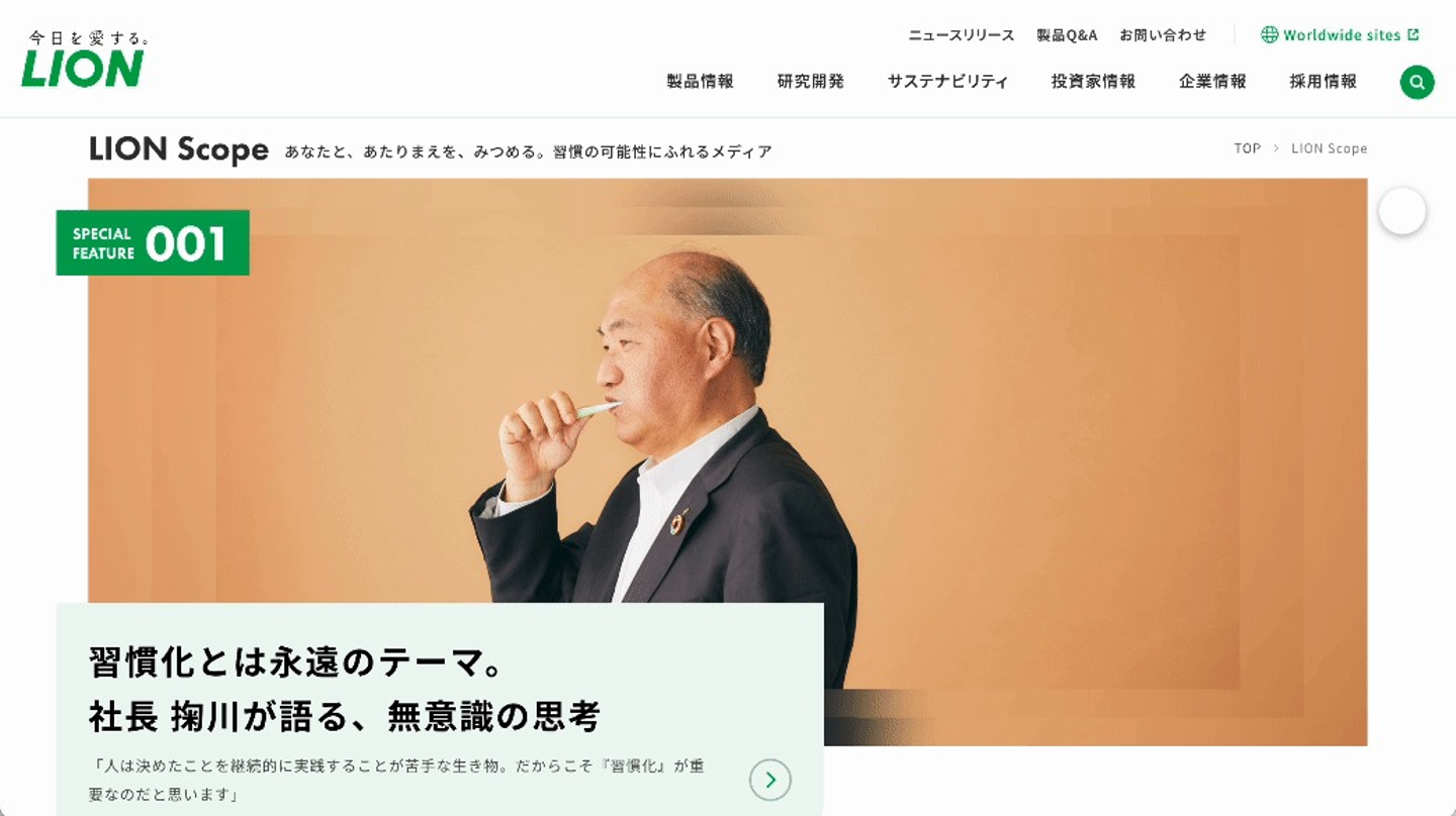 ライオン株式会社の「習慣」の可能性にふれるメディア「LION Scope」。「あたりまえ」になっている習慣の価値を見直し、積み上げることで大きな力を持つという考えのもと、さまざまな「人」に焦点を当て、その人ならではの習慣や習慣の持つ力、可能性について紐解くインタビュー記事などを掲載。CINRAは編集方針の策定から、記事コンテンツの制作、アートディレクションやサイト構築までをサポートした
