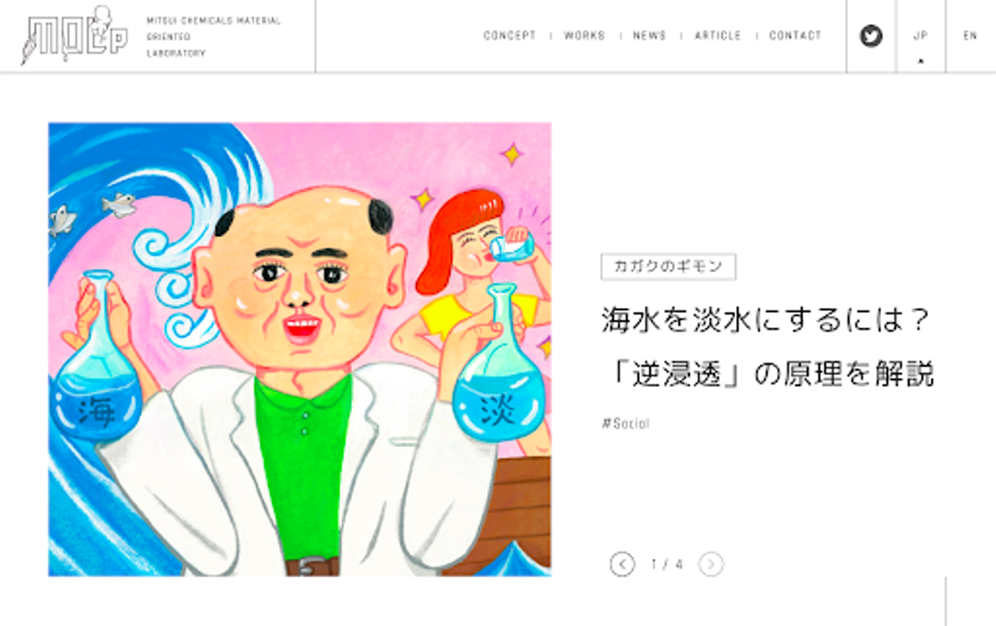 それらのコンセプトに従って、「MOLp」の活動を深掘りするインタビュー記事や、素材の魅力を伝えるコラムなどを展開。化学や素材にまつわる素朴な疑問に答えていく連載記事「カガクのギモン」では、イラストレーターのヘロシナキャメラさんにユーモラスなイラストを描いていただき、化学への親しみやすさを表現しました。また、アート面ではアーティストや造形作家などともコラボするプロジェクトを企画し、様々なクリエイターとのネットワークをもつ弊社の強みを活かしたメディアリニューアルを行いました。
