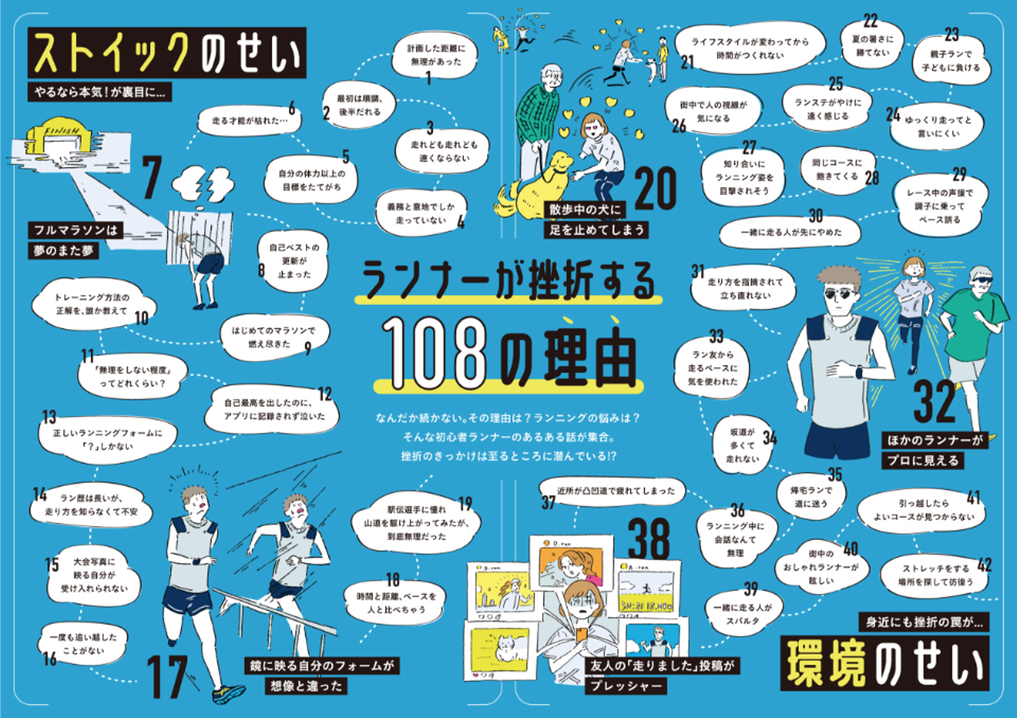 パンフレットでは、ファンランナーをイメージした4人のキャラクターをイラストで設計し、「全ランナーに贈る挫折あるある108」をイラストとコピーで表現。「走ろうと思った途端に雨」「ほかのランナーがプロに見える」「友人の走りました投稿がプレッシャー」など、ファンランナーなら一度は経験したことがある「あるある」を108個集め、イラストレーターのはしのちづこさんにユーモラスに描写いただきました。