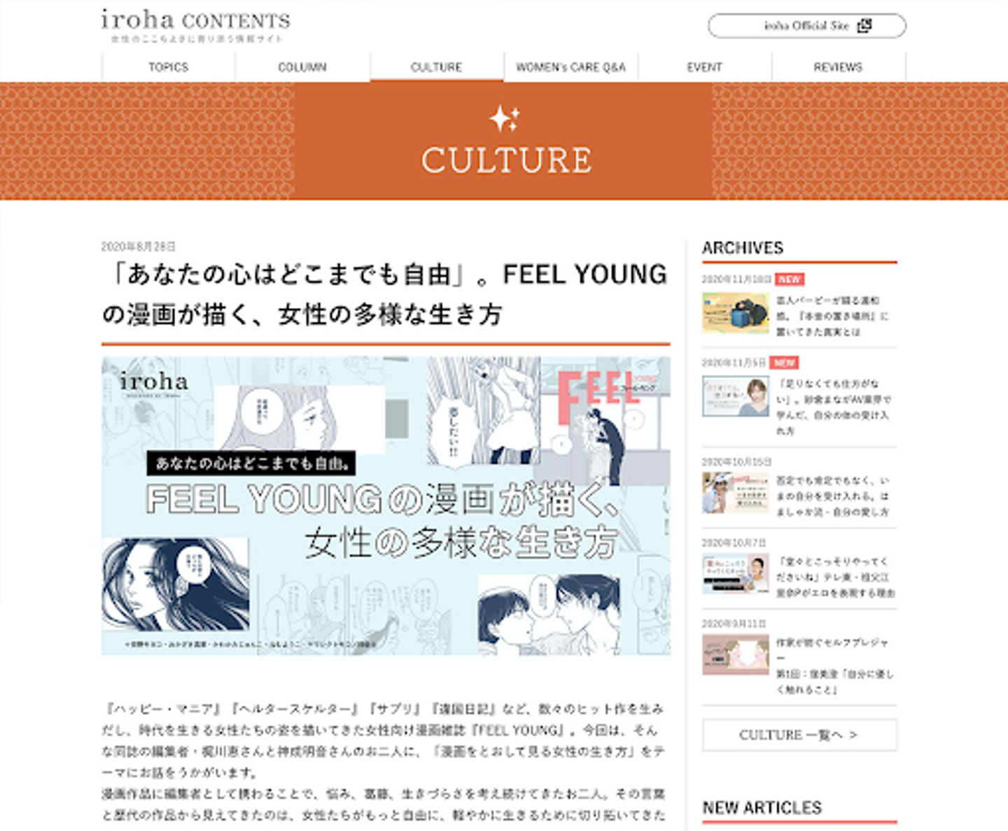 クライアントであるirohaには、女性が気持ちよさを追求することは決して恥ずかしいことではないと伝えるため、より多角的な視点のコンテンツを増やしていきたいという思いがありました。そこで、弊社のプロジェクトチームは、これまで培ってきたネットワークを活かしてコンテンツを企画・提案。人気イラストレーター・たなかみさきさんのインタビューをはじめ、多くの記事を制作。女性の「セルフプレジャー」と「カルチャー」を掛け合わせることによって、「iroha」や「セルフプレジャー」に関わる情報をより多くの人に届けることを目指しました。