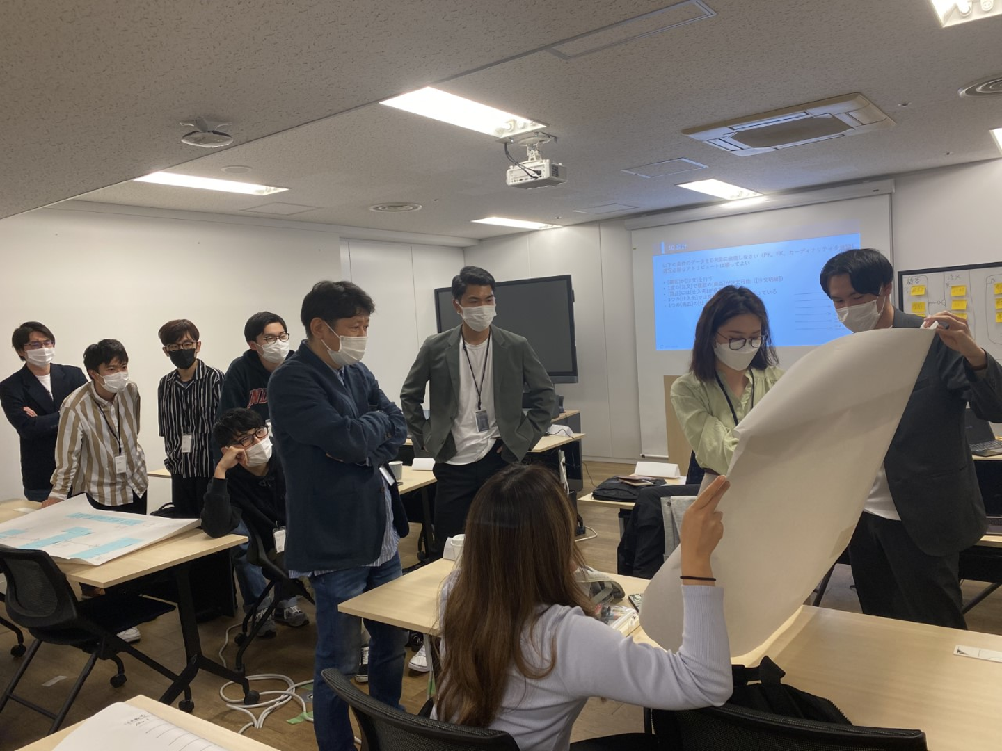 チーム内だけでなく他のチームとも互いに教えあいながら進めており、オンラインではなく集合研修ならではの光景でした。