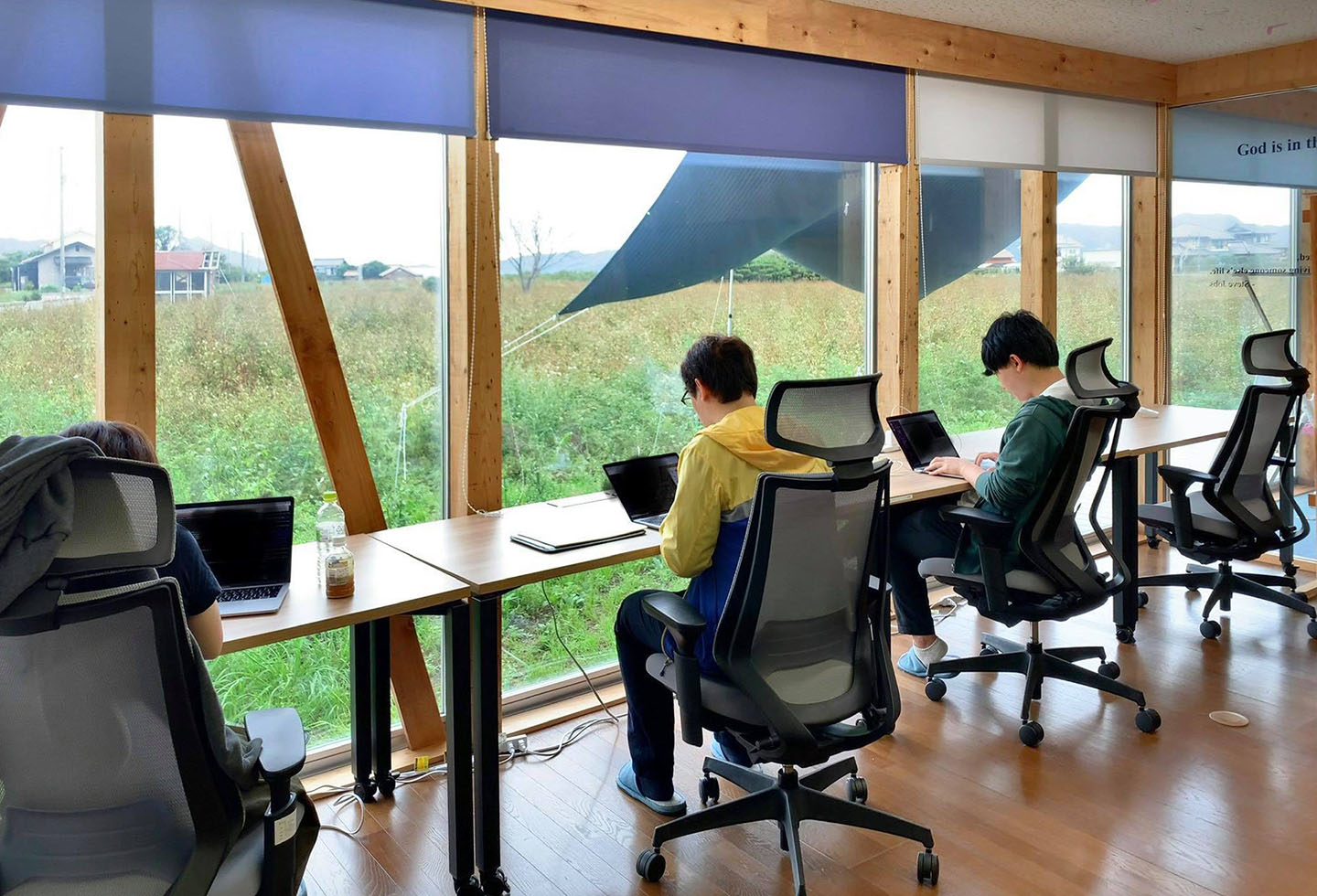 ココリト大根島はコワーキングスペース付きのゲストハウスです。コワーキングスペースからは農場が広がる風景が一望できます。自然の中でとてもリラックスして仕事に取り組めました。