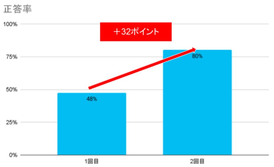 「最も復習したい単元」に関して、1回目のテストと2回目のテストの正答率は48%から80%と、32ポイントの上昇が認められました。