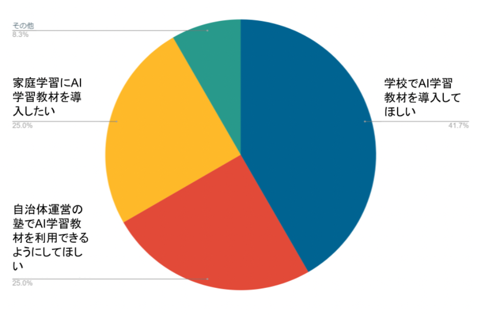 「学校でAI学習教材を導入してほしい」が最多であり、次いで「自治体運営の塾でAI学習教材を利用できるようにしてほしい」、「家庭学習にAI学習教材を導入したい」と回答しました。