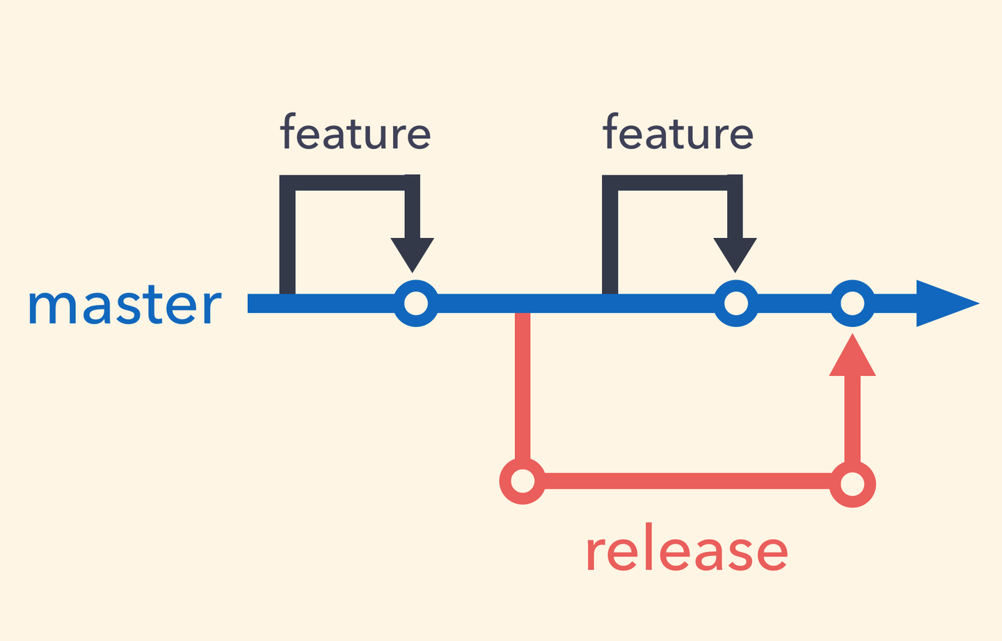 master ブランチを開発ブランチとし、リリース時には release ブランチを作成、リリースされたタイミングで master にマージしています。