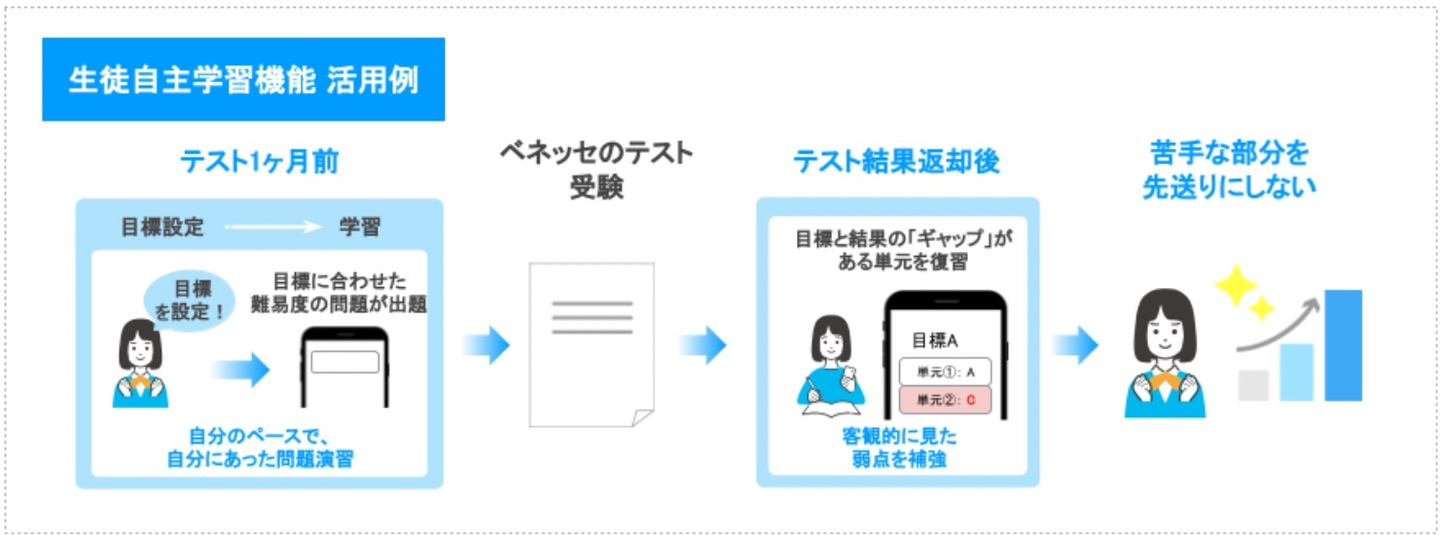 学トレ機能には、①生徒が模試の結果から個人で自律的に学習を進められる「自主学習機能」と、②先生が課題を配信し、その結果から個人に合わせた学習課題が提案される「先生課題配信機能」が搭載されています。いずれも、生徒個人に合わせた学習課題を提案でき、何から勉強すれば良いかわからない、学級内での習熟度にばらつきがあって、全員同じ問題を解いていくだけでは個々の学力習得が難しい、などの課題を解消に繋げていくことが可能です。