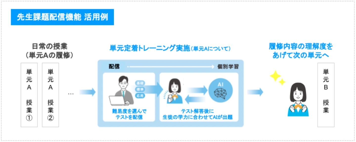 一つ目は、クラス内での学力にばらつきがある状態で、全員同じ問題を解くだけでは個々の学力習得が難しいという課題で、二つ目は生徒の皆さんが学習する際に、学力向上に向けて最適な問題がわからないという課題です。先生から一律で生徒全員に同じ課題を配信するのではなく、AIが個人の解答をリアルタイムに分析し、各々の実力に合った問題が提供されることで、生徒は自分の状況に応じて学習を進めることが可能となります。