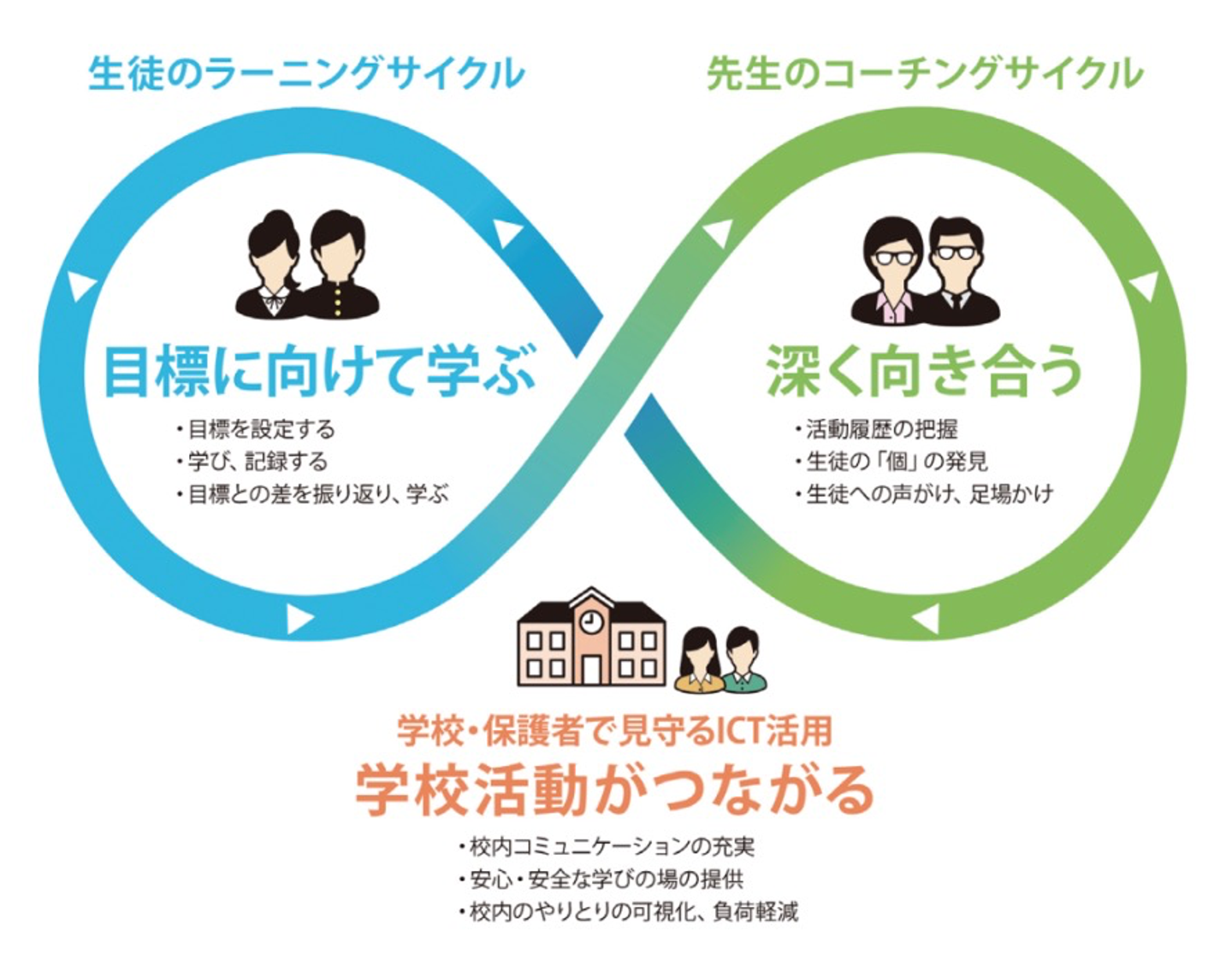 Classiは、学校現場で特に重要な、生徒の学習サイクルを支援するカテゴリーの機能(学習トレーニング、Webテスト、学習動画)と先生のコーチングサイクルを支援するカテゴリーの機能(学習記録、生徒カルテ、ポートフォリオ)、生徒・保護者と先生とのコミュニケーションを支援するカテゴリー(校内グループ、メッセージ、保護者欠席連絡)の3つのカテゴリー機能を兼ね備えた総合型プラットフォームです。