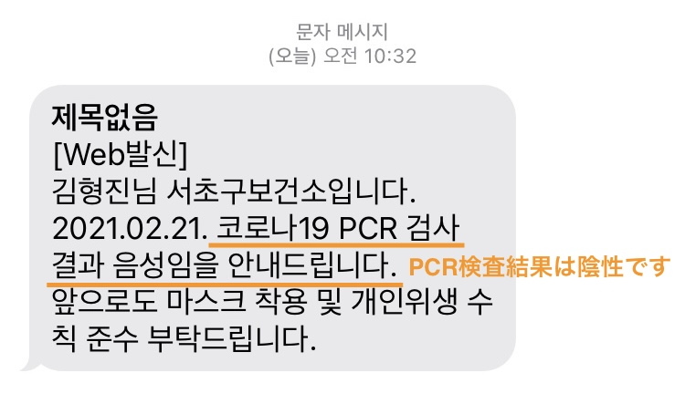 並んでいる方を見ると、ほとんどが私のように解除前の検査で来られた方のようでした。翌日の午前9時頃、メールで結果が届きました。無事に陰性だったので、その日の午後12時から隔離が解除されました。