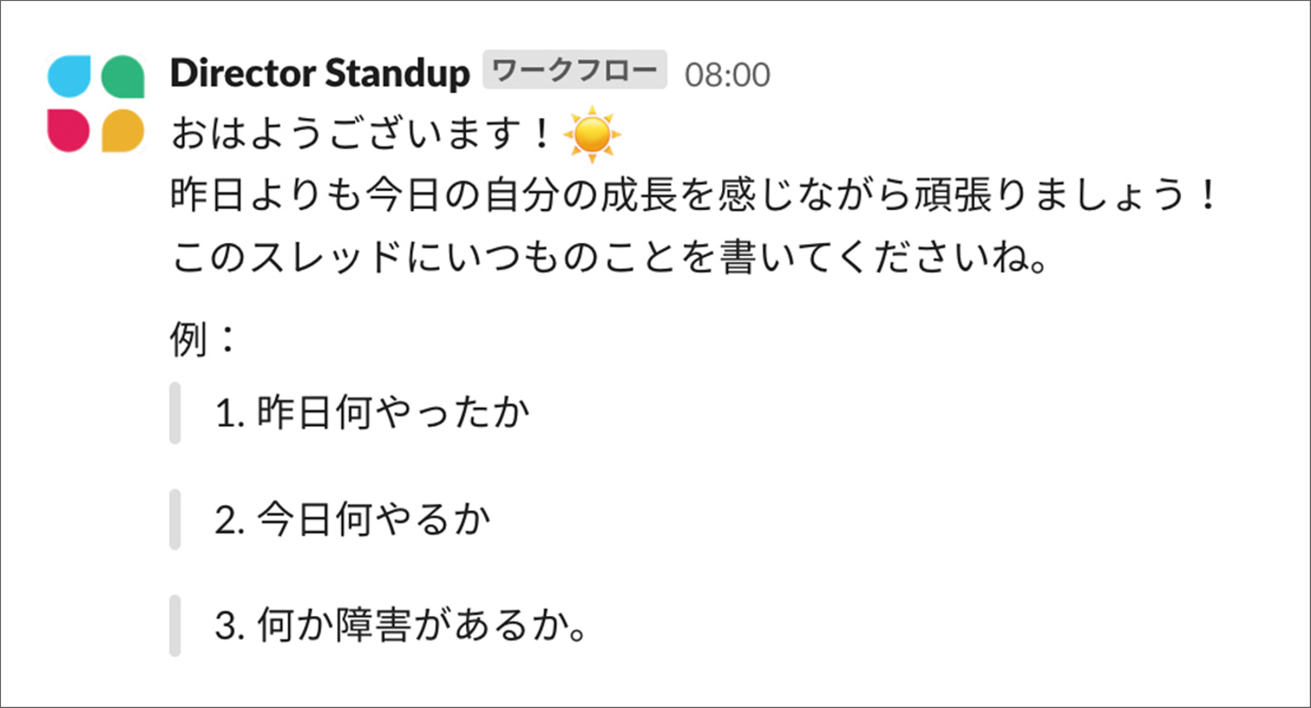 弊社では朝の時間に 「昨日こんな事しました。今日こんな事やります」って宣言をしてもらっています。