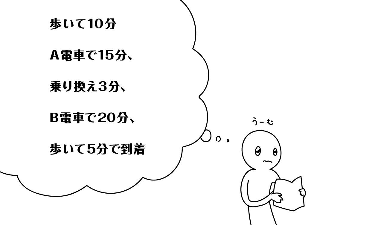 歩いて◯分、A電車で◯分、乗り換え○分、B電車で○分、歩いて◯分で到着 という流れを見ます。