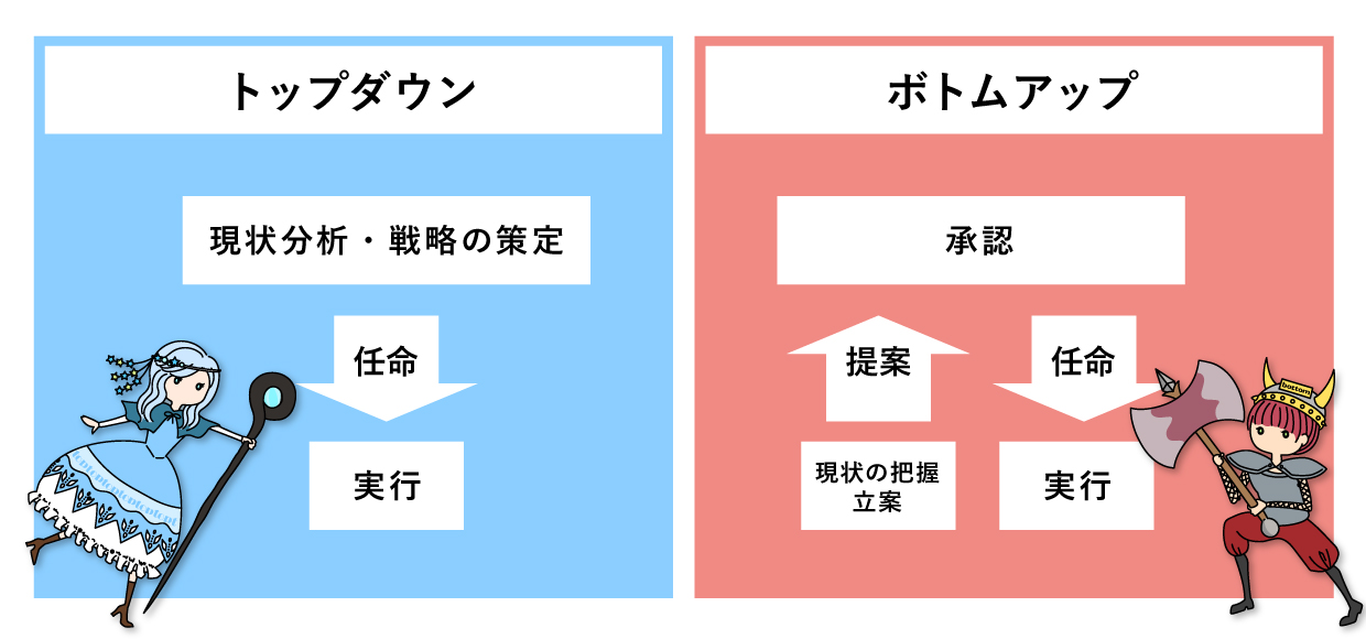 本題の「トップダウン」と「ボトムアップ」についてですが、はっきり言うと「トップダウン」「ボトムアップ」どちらも必要です。そのバランスが異なるだけだと考えるべきです。
