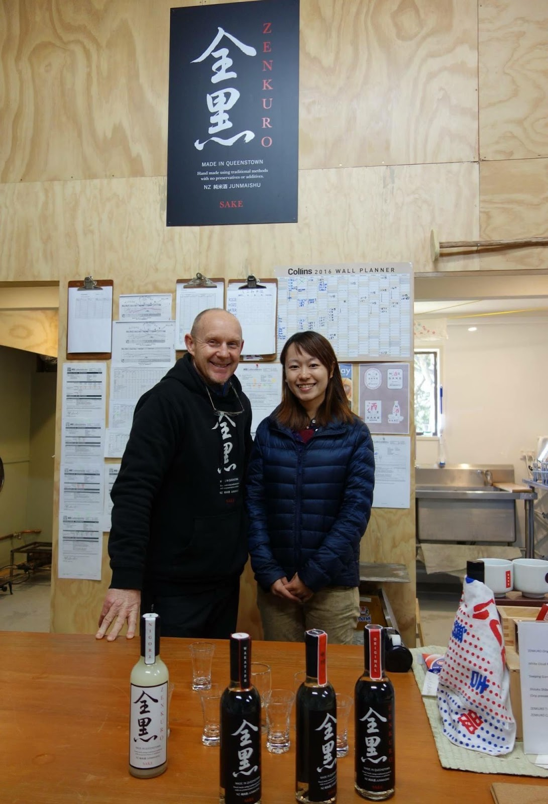 ▲ニュージーランドの酒蔵「全黒」のオーナー杜氏デイビッドさんと。試行錯誤を繰り返しながらSAKEをいちから学び醸造していった経験を、身振り手振りを加えて熱心に話してくれた。