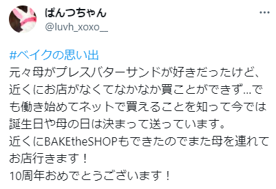 創業から10周年を迎えた今年4月、BAKEとの思い出をSNSに投稿していただくキャンペーンを行い、短い期間の開催だったにも関わらず500名以上のお客様が参加してくださいました。