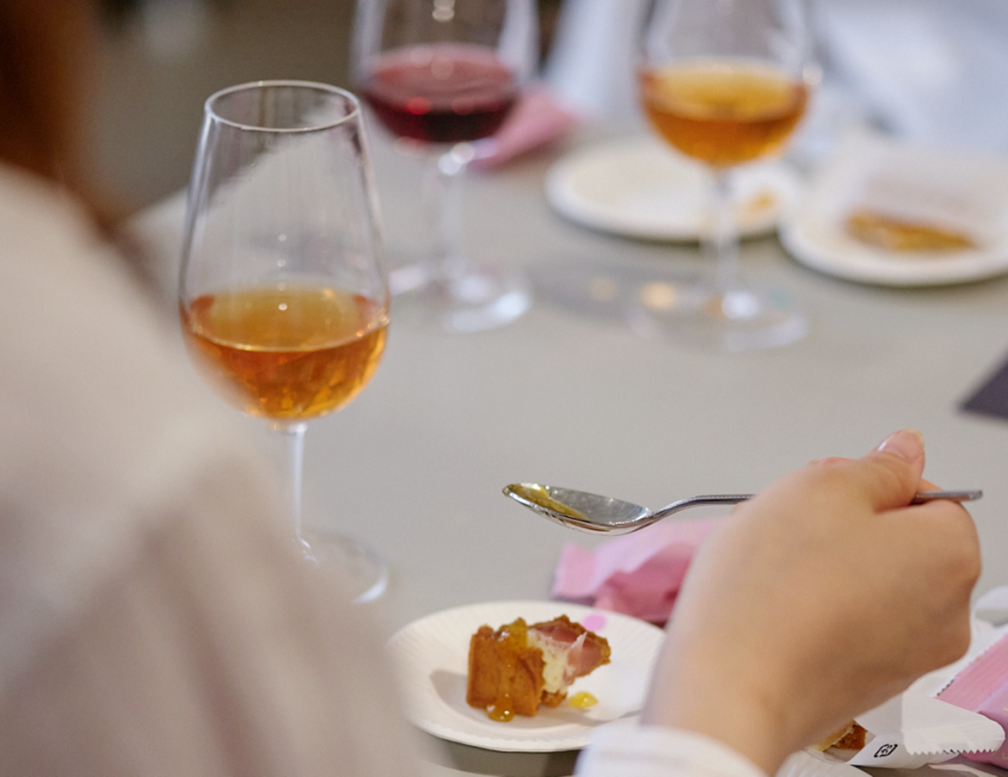 オレンジワインと「バターサンド〈桃〉」のペアリング体験の様子